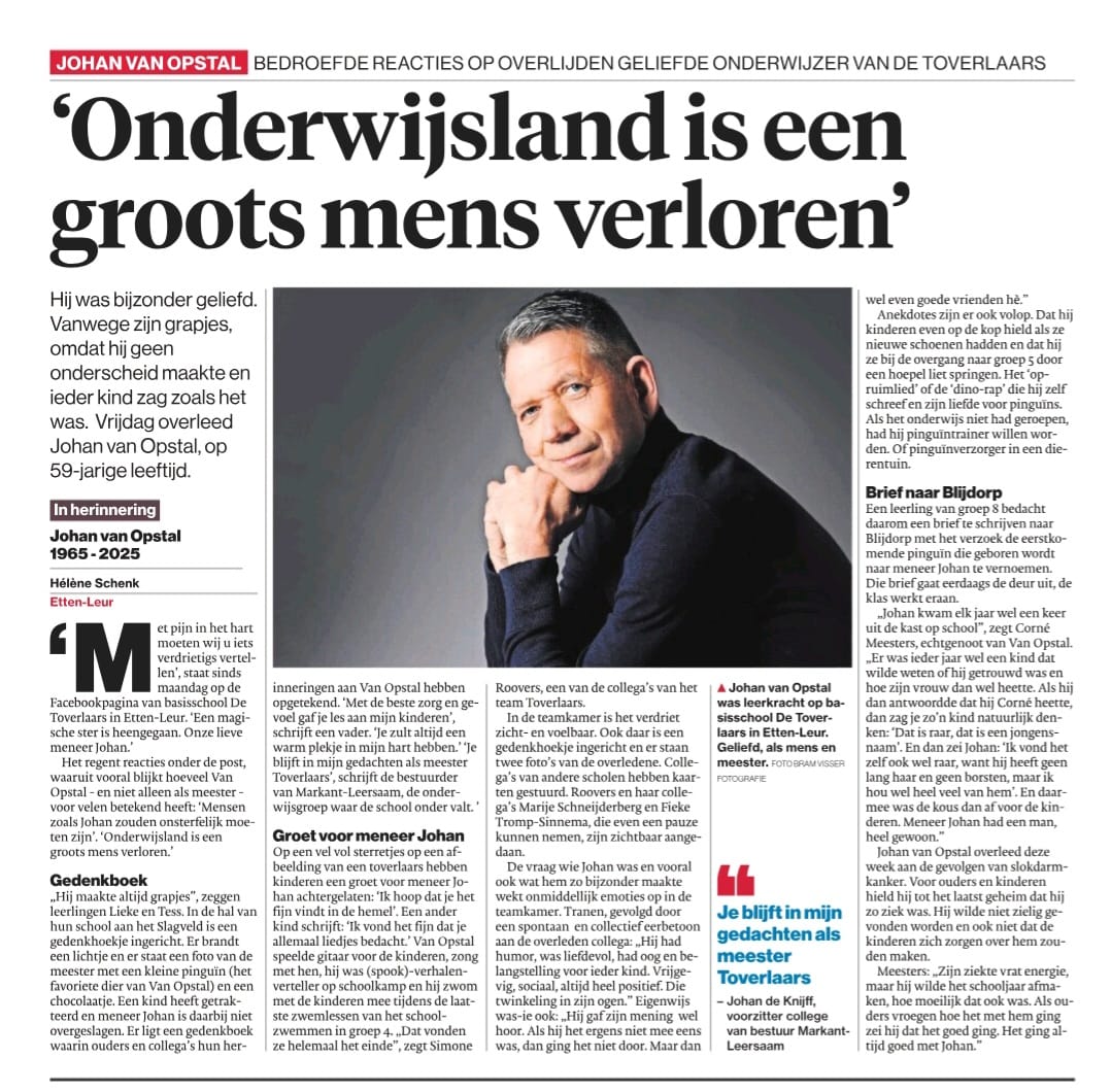 In de laatste weken zijn wij als onderwijsgroep Markant-Leersaam zwaar getroffen door het verlies van een zeer gewaardeerde leerkracht bij De Toverlaars en door het verlies van onze zeer gewaardeerde directeur van De Tweesprong. In BN/DeStem is voor beiden een prachtig "in herinnering" verschenen.